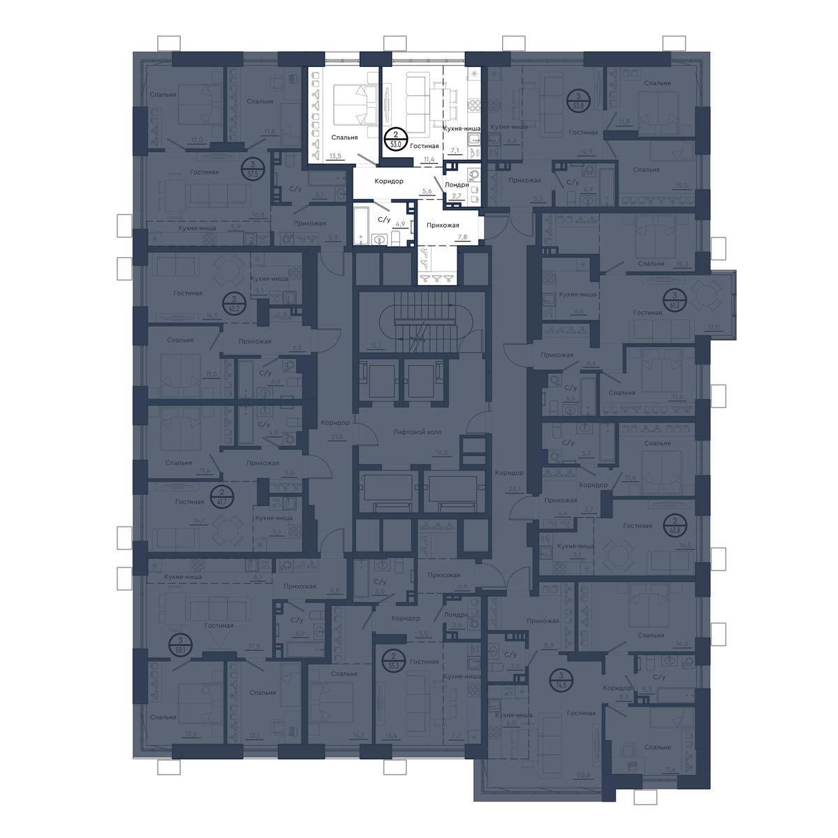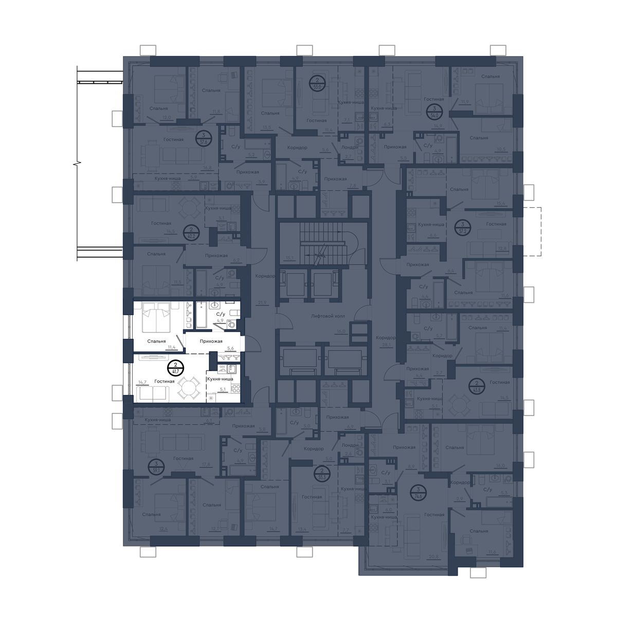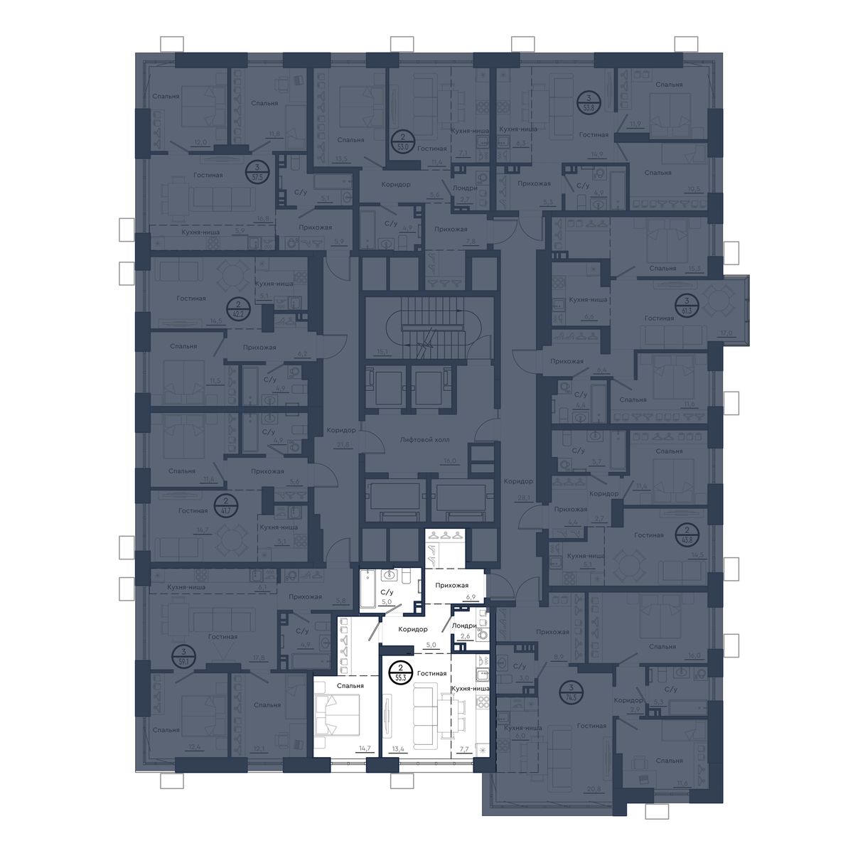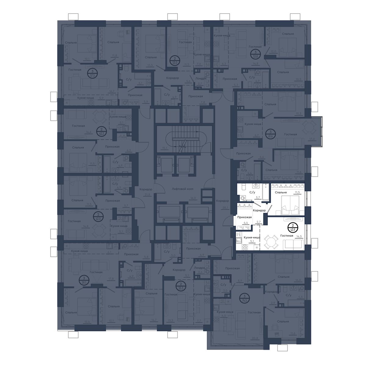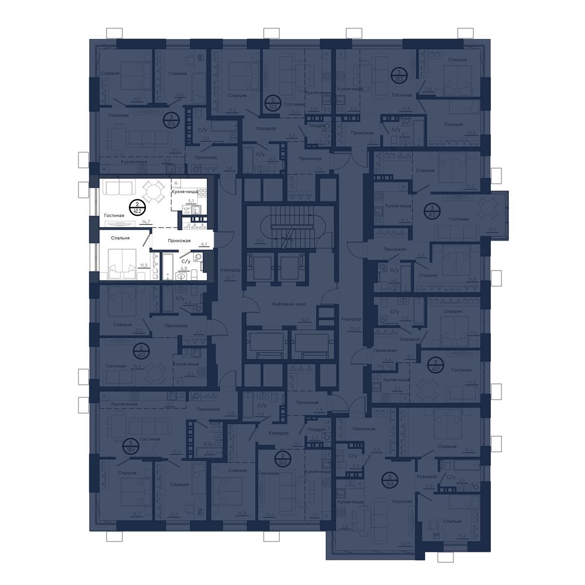 | 2-комн | от 42 м² до 63 м² | от 7,13 млн ₽ | 145 |