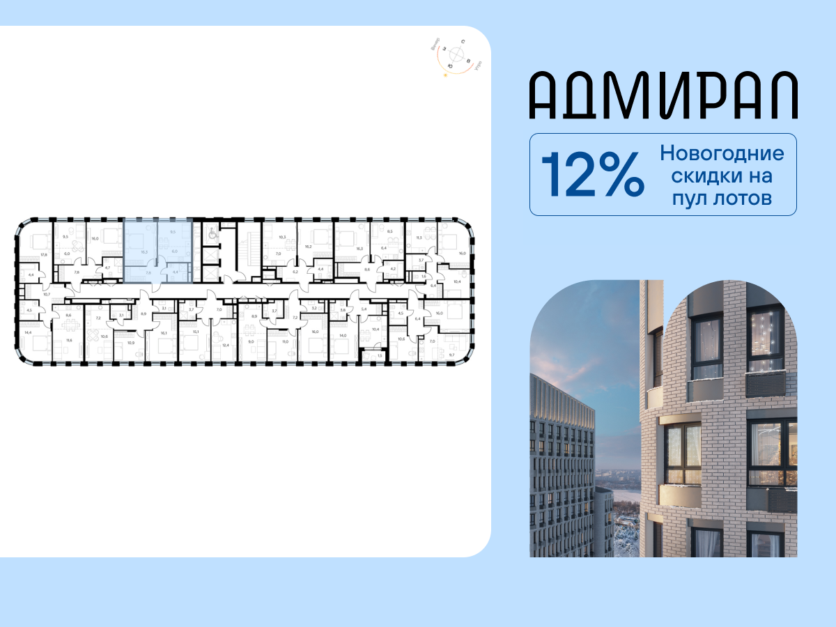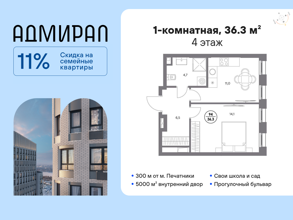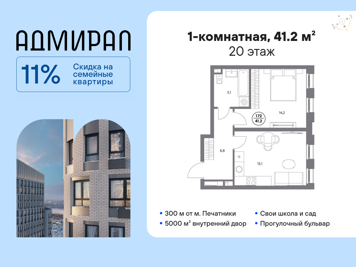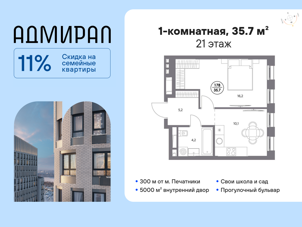 | 1-комн | от 35 м² до 41 м² | от 18,53 млн ₽ | 11 |