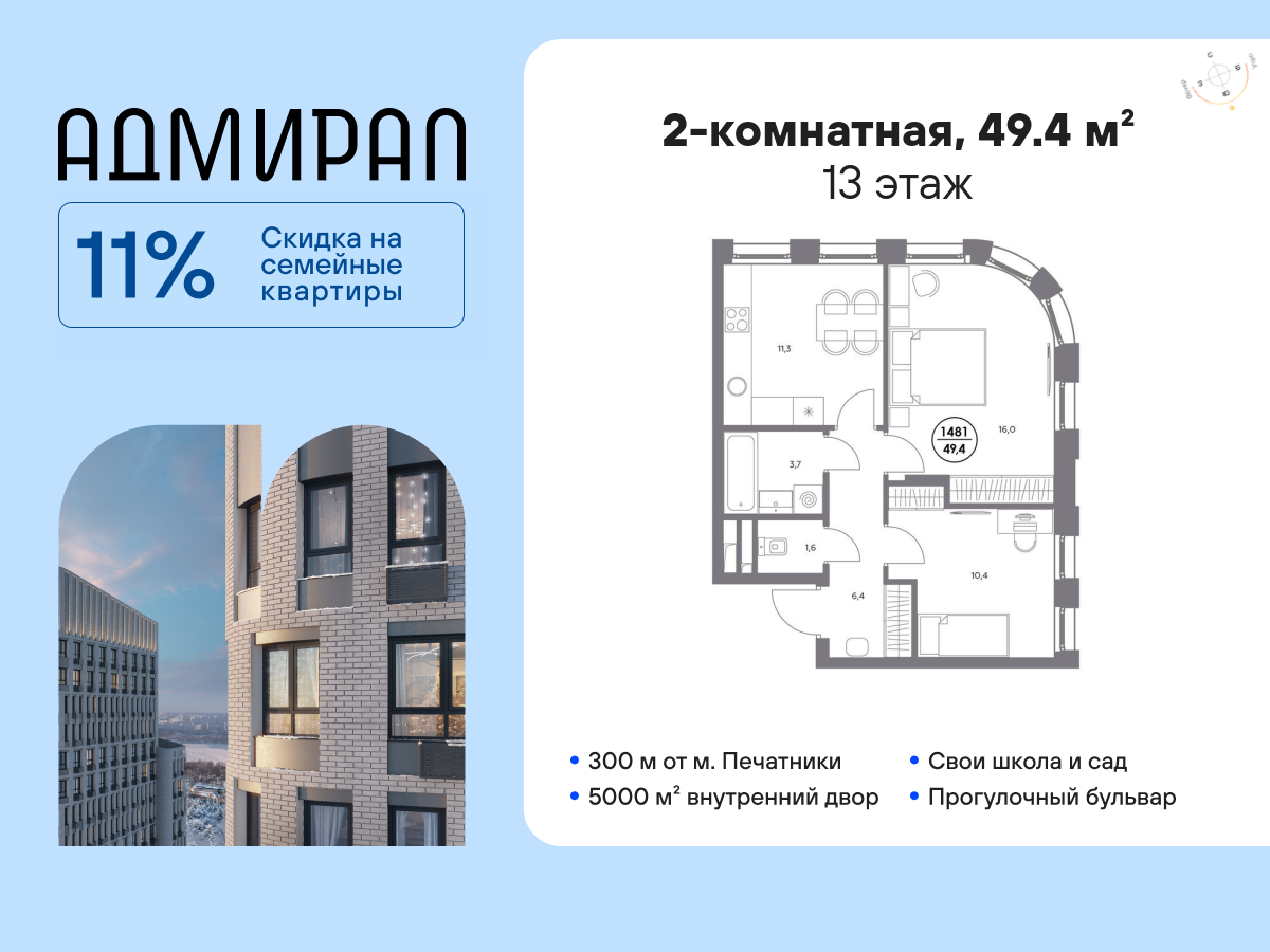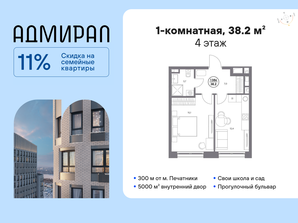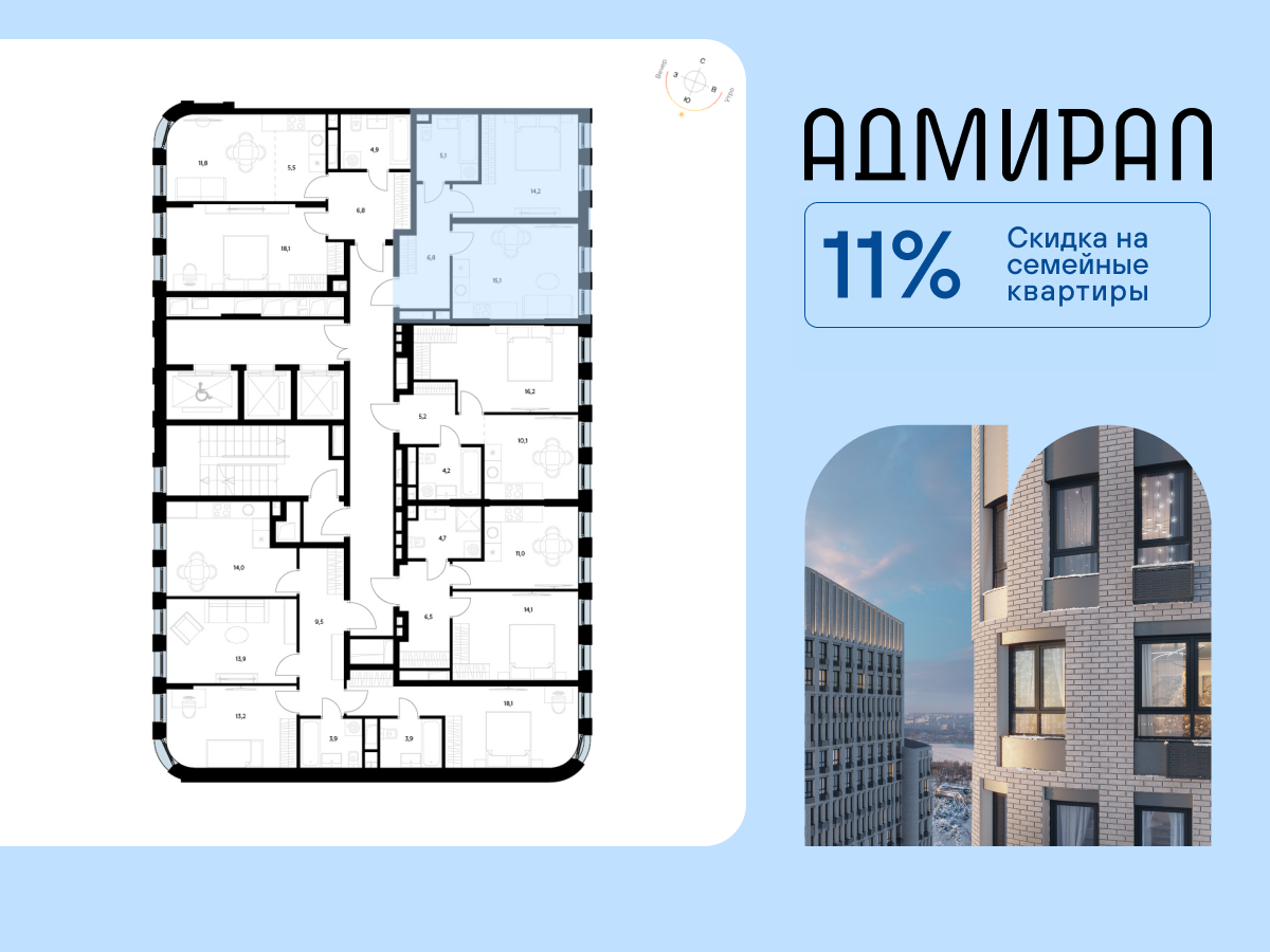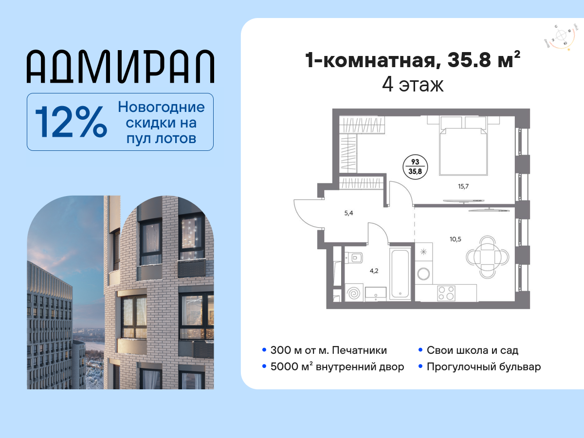 | 1-комн | от 35 м² до 41 м² | от 18,53 млн ₽ | 11 |