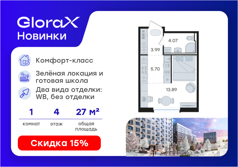 | Студии | от 20 м² до 28 м² | от 3,94 млн ₽ | 47 |
