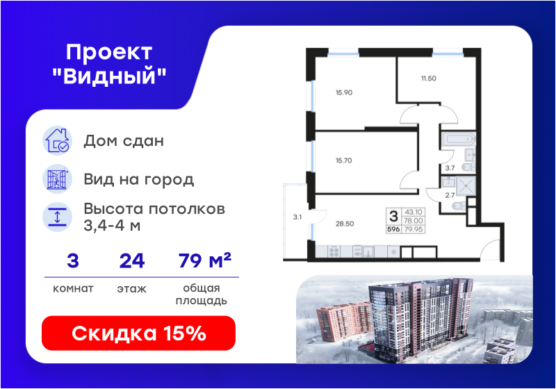 | 3-комн | от 79 м² | от 13,37 млн ₽ | 1 |