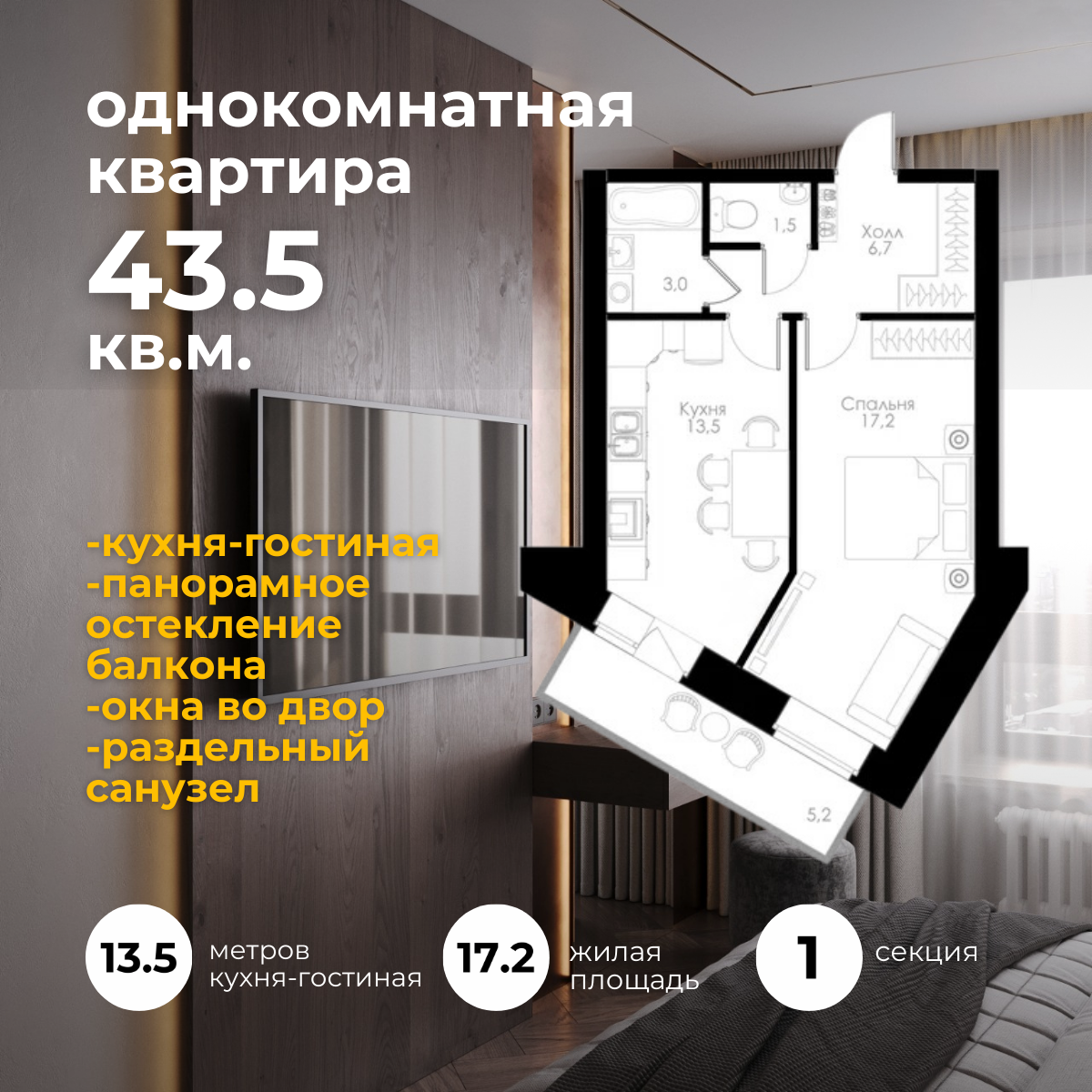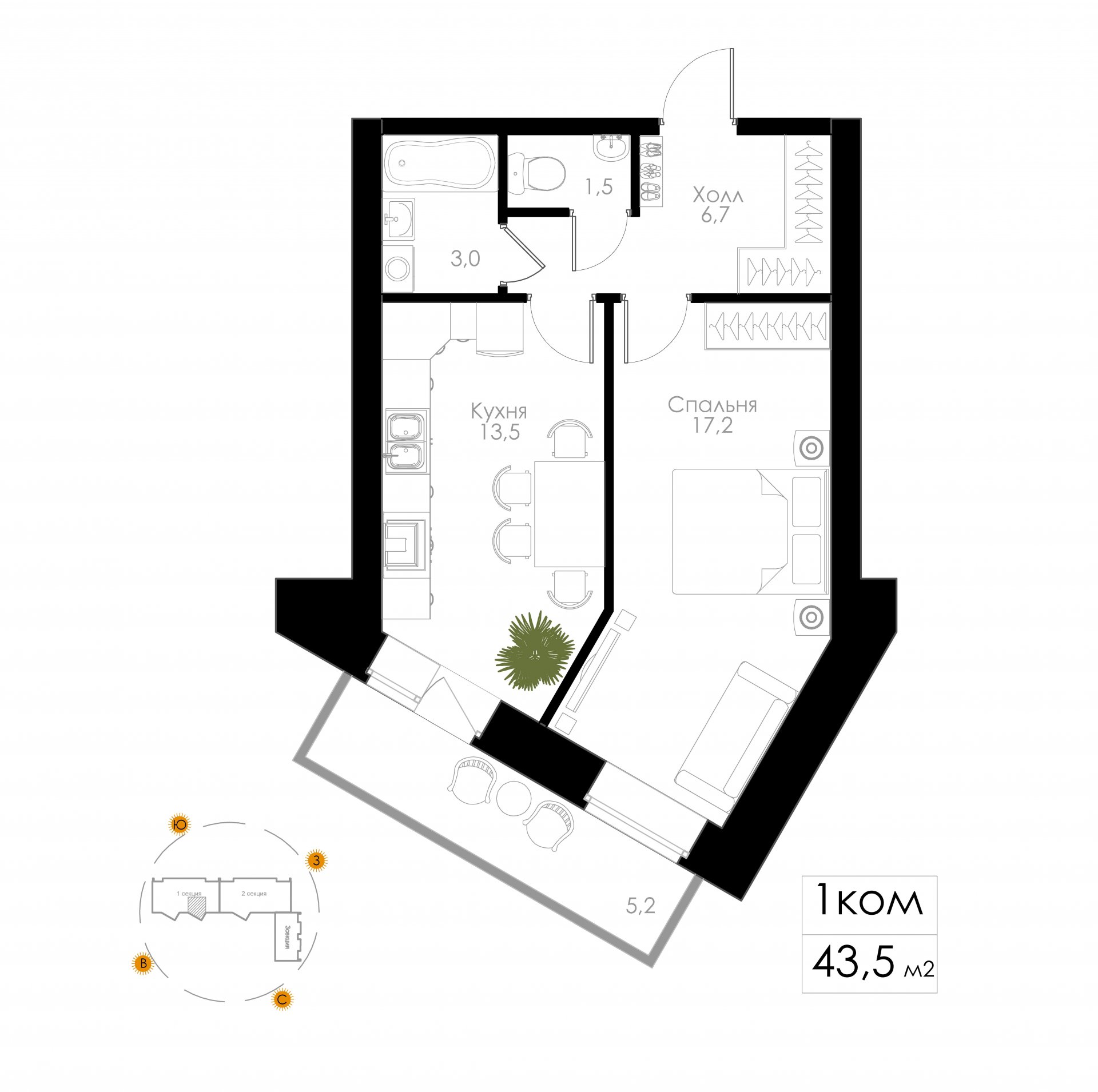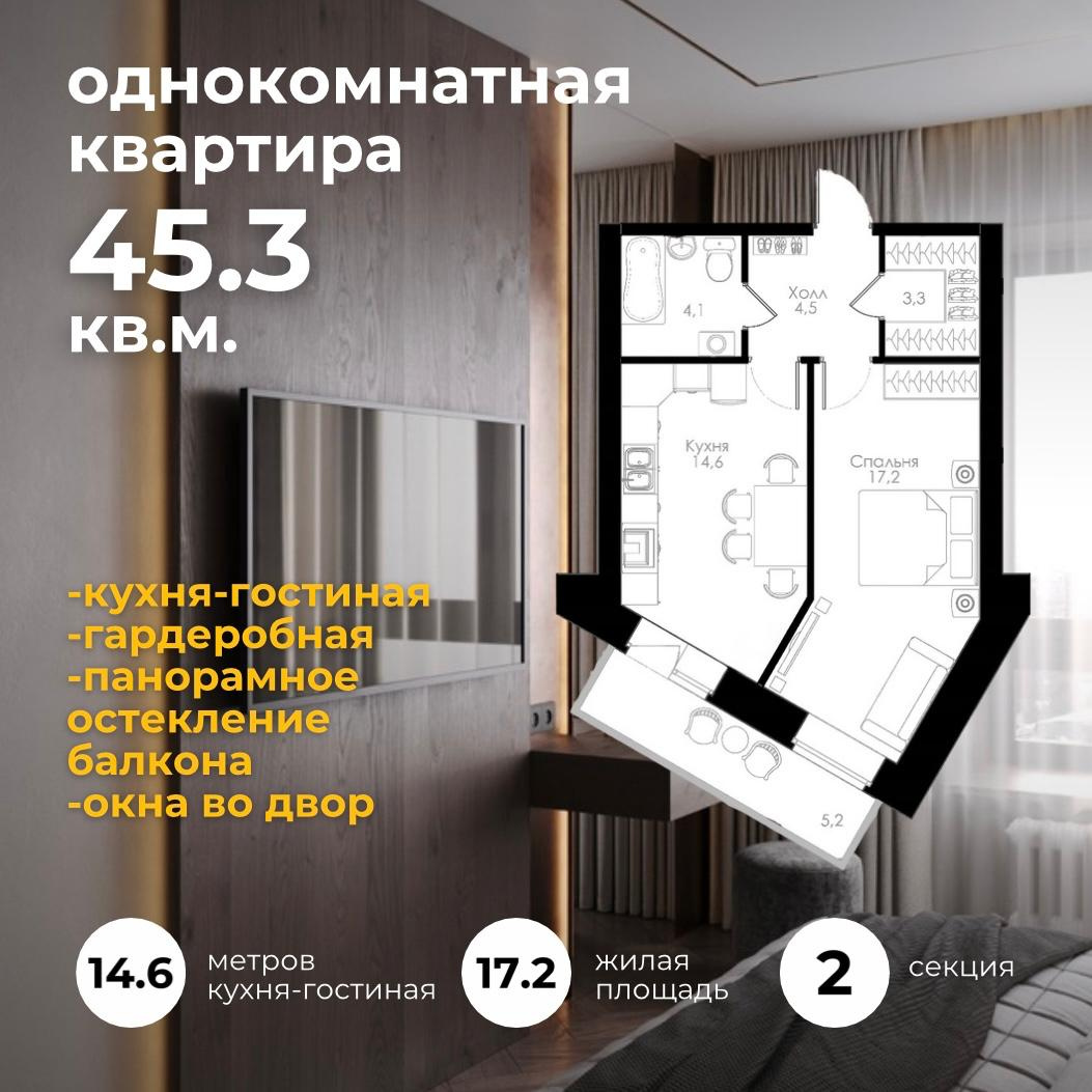 | 1-комн | от 44 м² до 45 м² | от 5,69 млн ₽ | 3 |