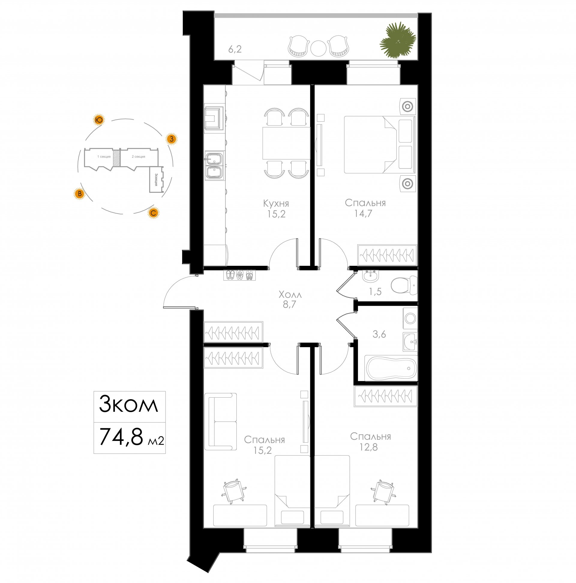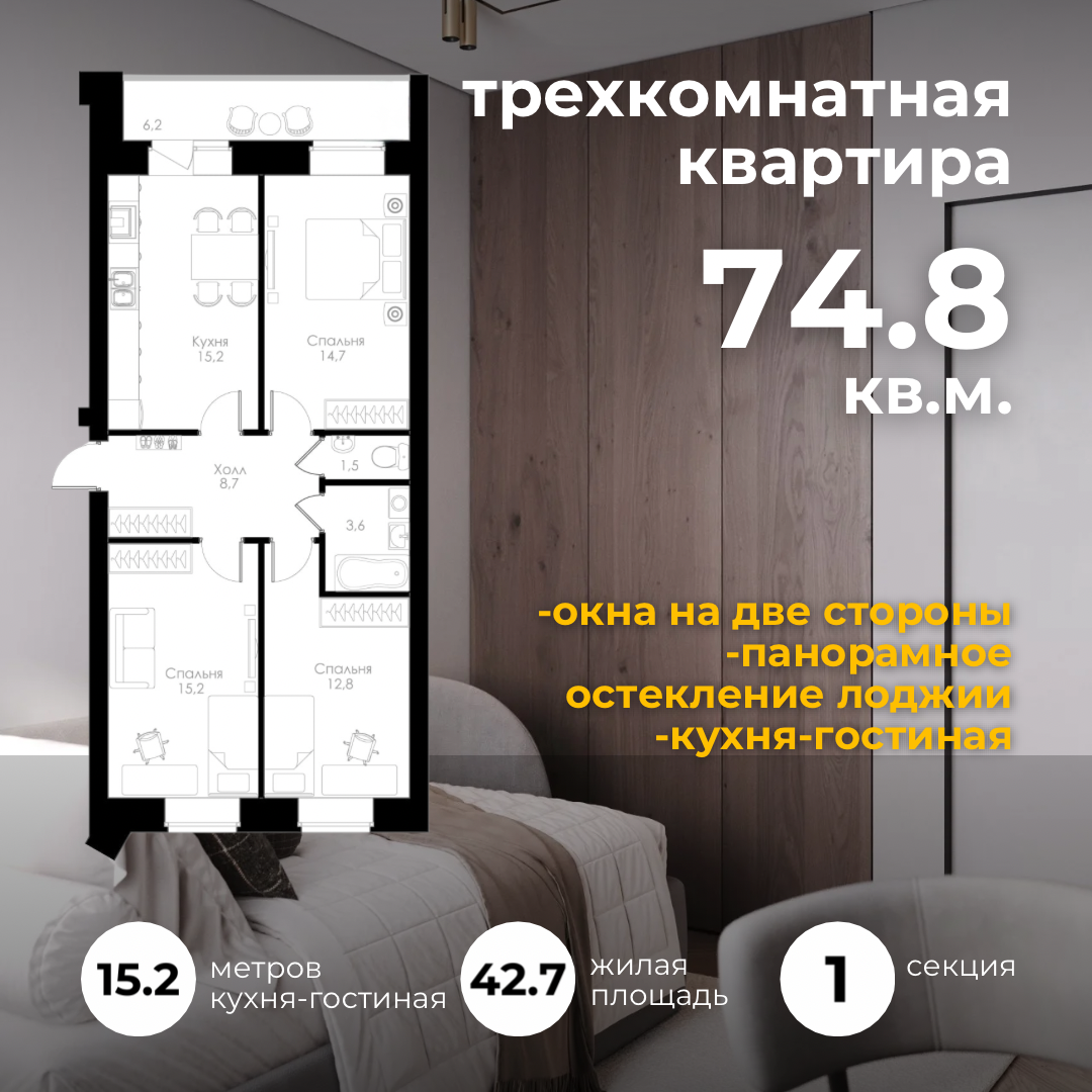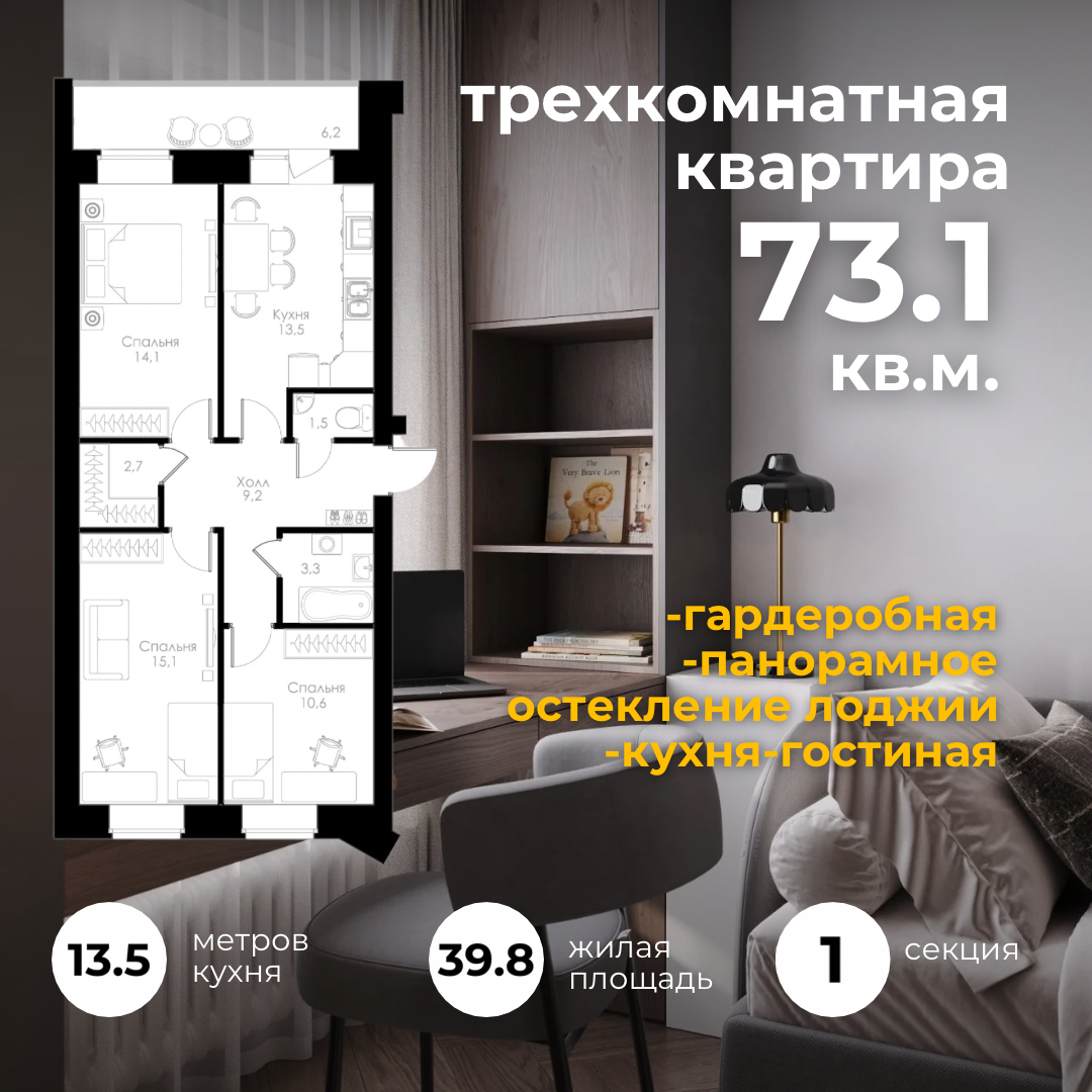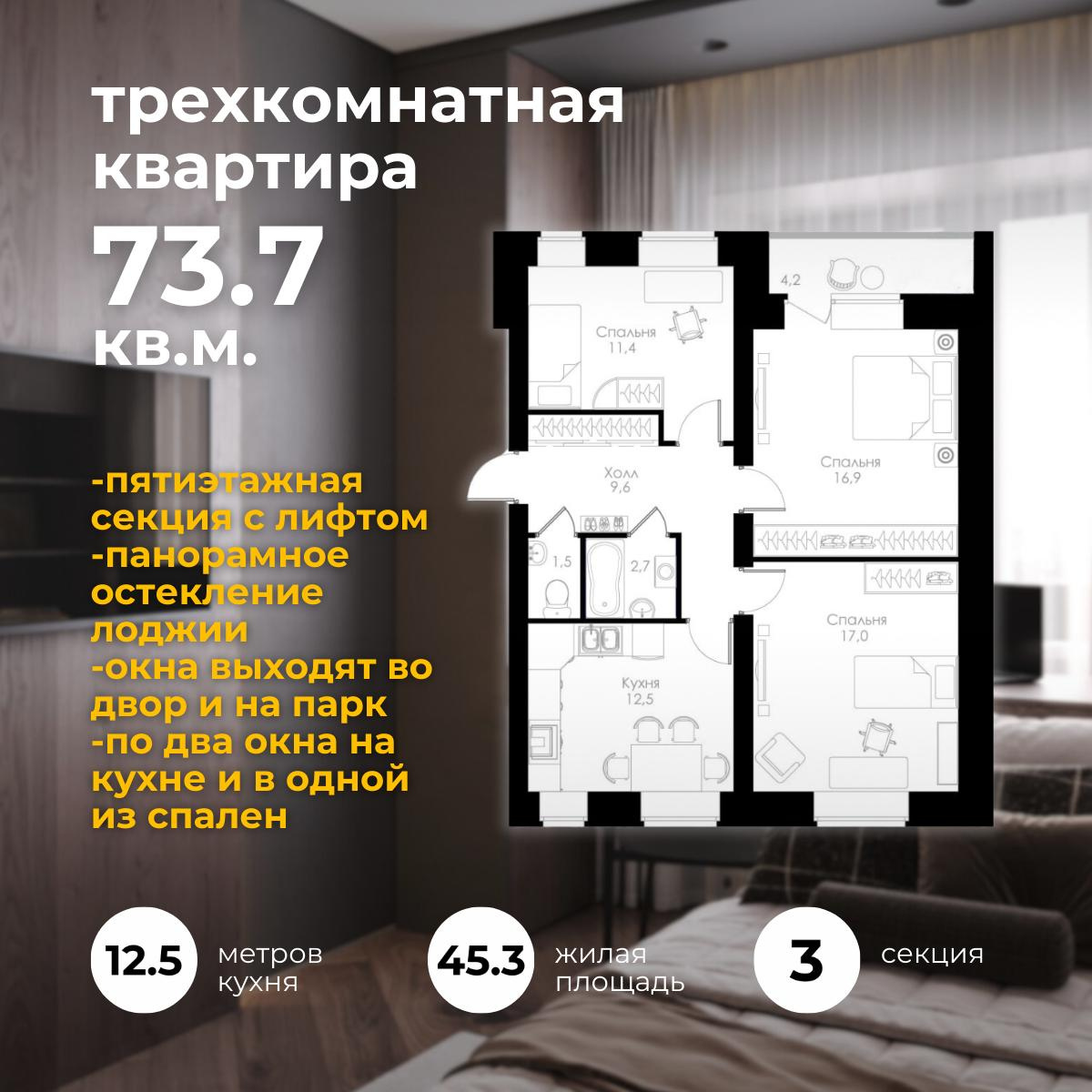 | 3-комн | от 69 м² до 75 м² | от 8,98 млн ₽ | 7 |