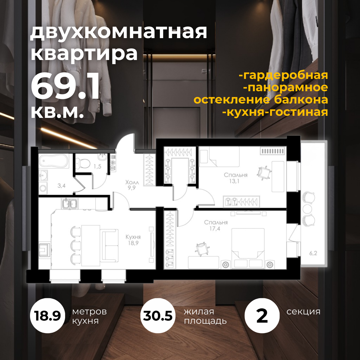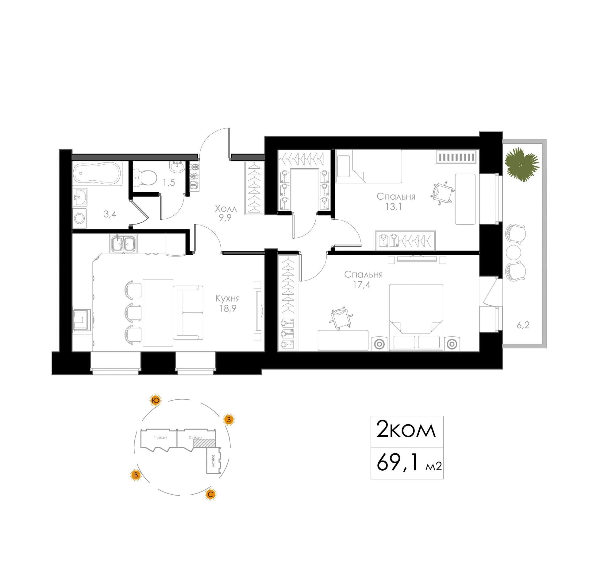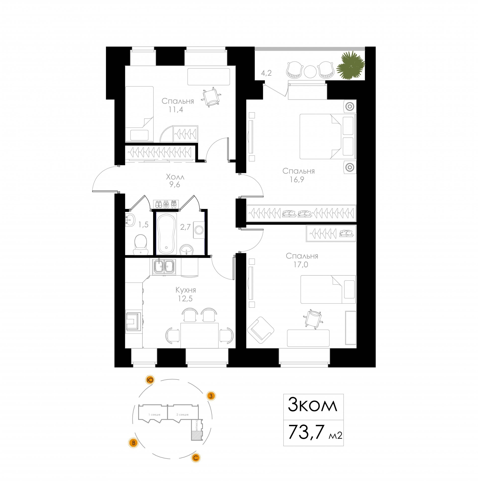 | 3-комн | от 69 м² до 75 м² | от 8,98 млн ₽ | 7 |